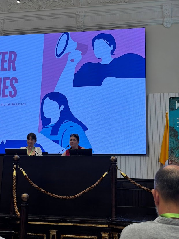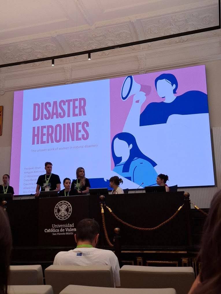 Expanding on this, Caoimhe described her team’s project, “Empowering Women for Natural Disaster Preparedness”, and explored how “we can equip women to respond effectively during disasters, recognising their often overlooked leadership qualities such as empathy, emotional intelligence, and remaining calm under pressure”. As part of the project, Caoimhe and her team conducted research on women’s participation in disaster response and developed a training plan designed to prepare women to lead and act confidently in crisis situations.